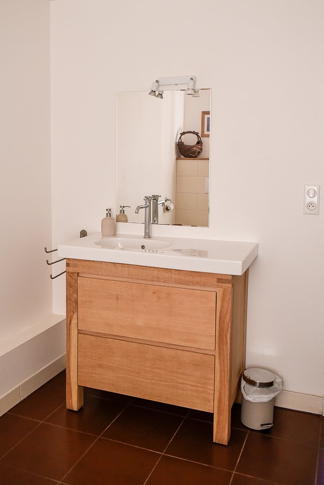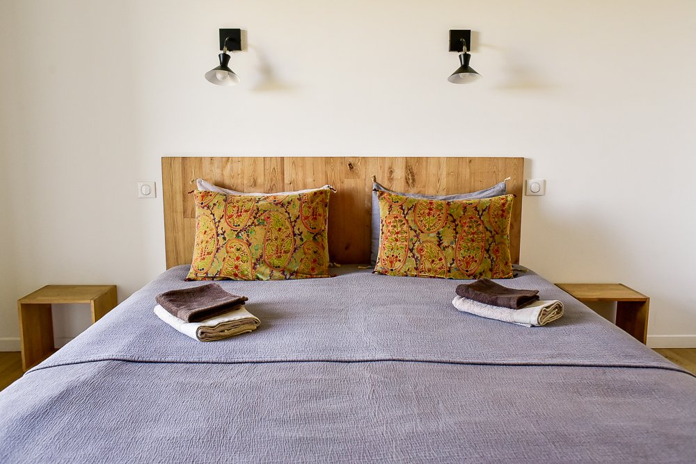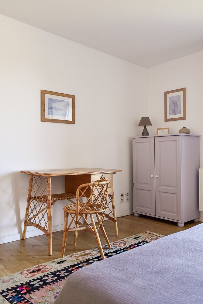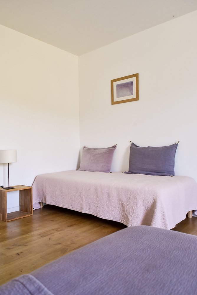 double (180×200) et une personne dans un lit simple (80×190). Un bureau est à disposition pour les hôtes inspiré.es et laborieux.ses. La chambre est au premier étage mais accessible directement de la cour car la maison est semi-enterrée.