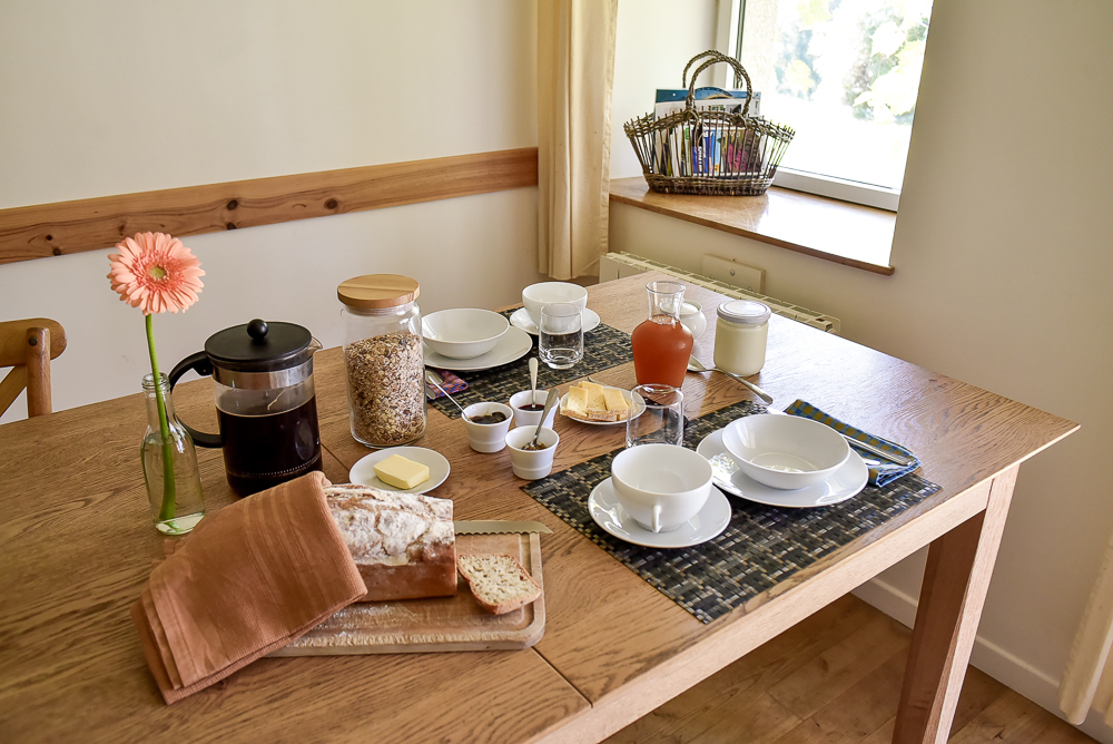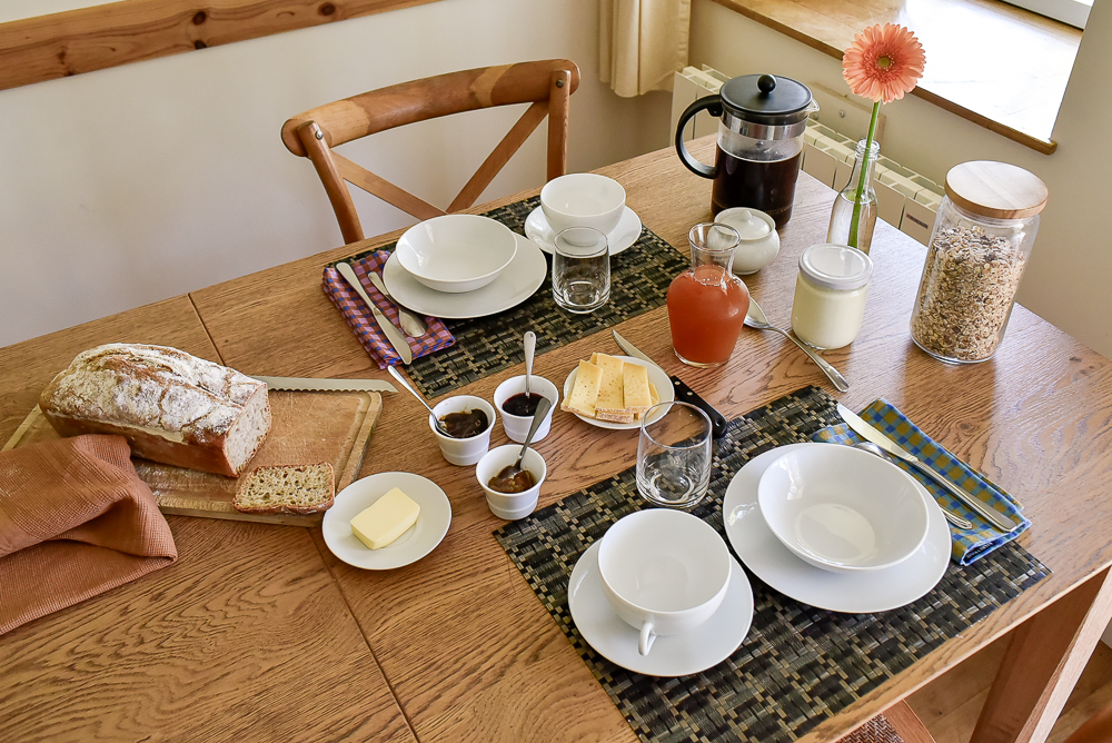 Les petits déjeuners sont servis dans la salle à manger ou sur la terrasse lorsqu’il fait bon. Nous avons à coeur de vous proposer de bons produits authentiques, biologiques et locaux. Gaëlle fait son pain aux graines avec amour ainsi que les confitures. Les miels sont fournis par des amis apiculteurs. Le jus de pomme est réalisé à partir de pommes locales. Les yaourts et fromages sont confectionnés par des ami.es paysan.nes dans deux fermes proches de la maison. Miam !