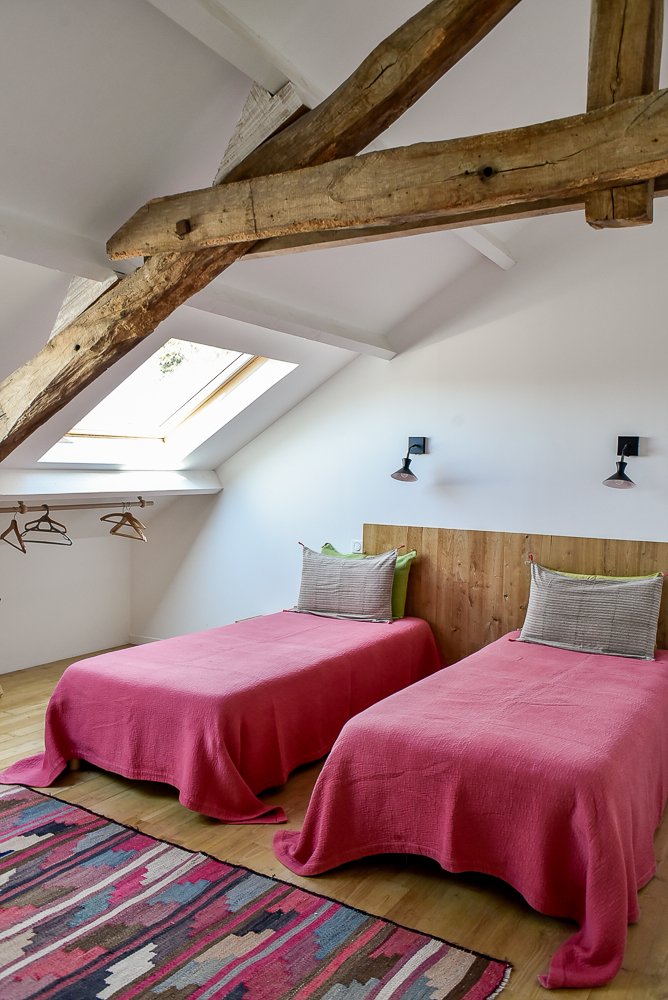 Les chambres de Maison Chalendeix sont une invitation à l’abandon et à la contemplation. Vous vous sentirez bien dans ces grands espaces confortables, baignés de lumière en toutes saisons grâce aux grandes ouvertures qui donnent sur le vallon. La décoration est épurée, ponctuée de touches de couleurs lumineuses apportées par les dessus de lit et les oreillers sélectionnés chez Caravane, et animée ici et là par le mobilier chiné et les vanneries artisanales locales. Chaque chambre possède sa spacieuse salle de bain.