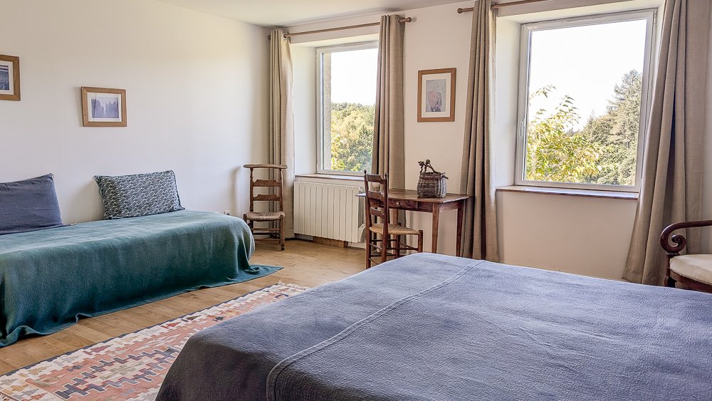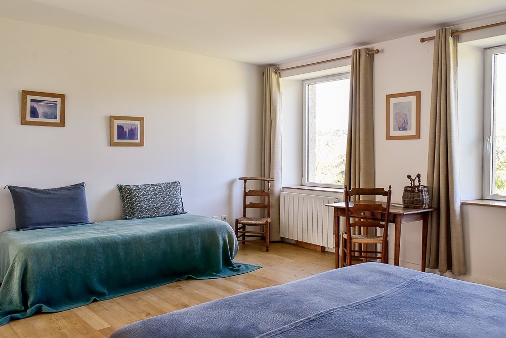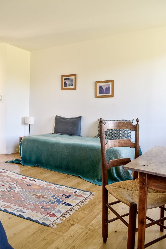 Elle peut accueillir trois personnes dans des lits simples séparés, ou deux personnes dans un grand lit double (180×200) et une personne dans un lit simple (80×190). Un bureau est à disposition pour les hôtes inspiré.es et laborieux.ses. La chambre est au premier étage mais accessible directement de la cour car la maison est semi-enterrée. C’est la plus spacieuse.