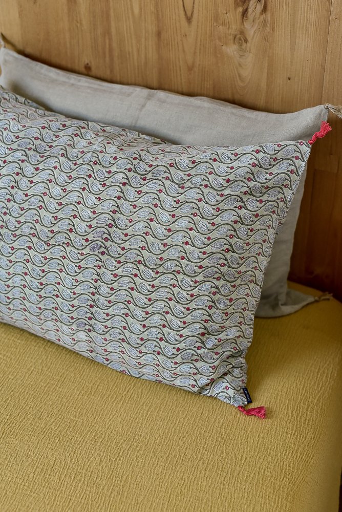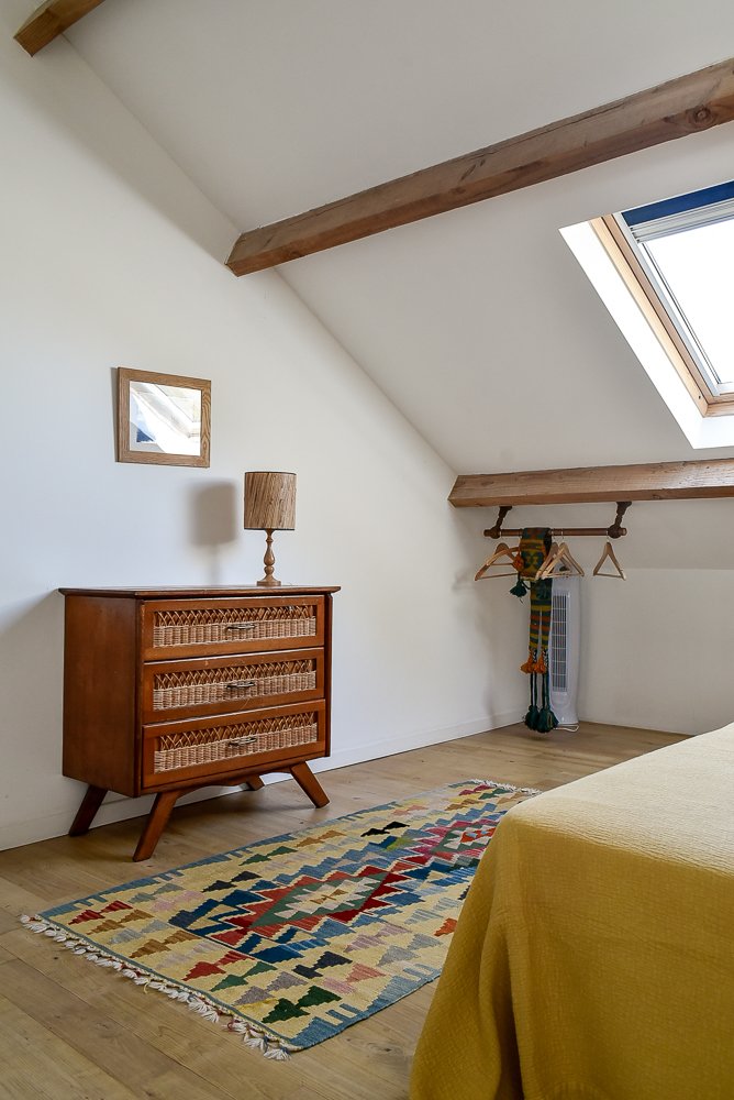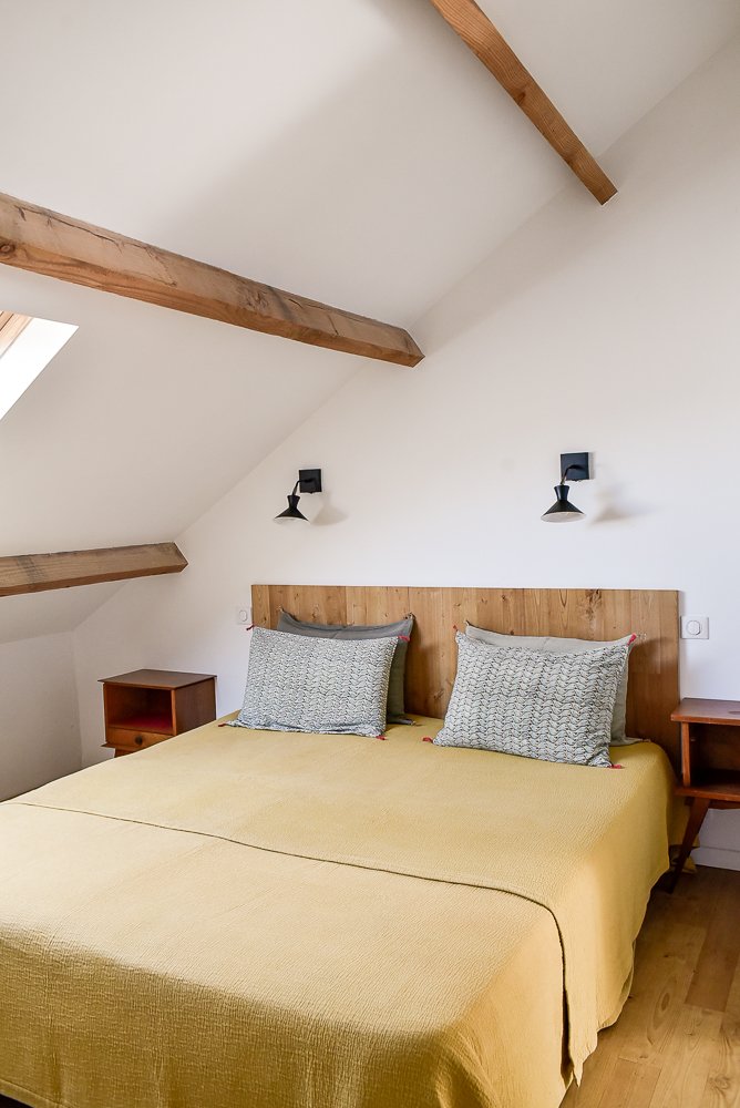 Elle peut accueillir deux personnes dans des lits simples séparés (90×200) ou dans un grand lit double (180×200). Un bureau est à disposition pour les hôtes inspiré.es et laborieux.ses.