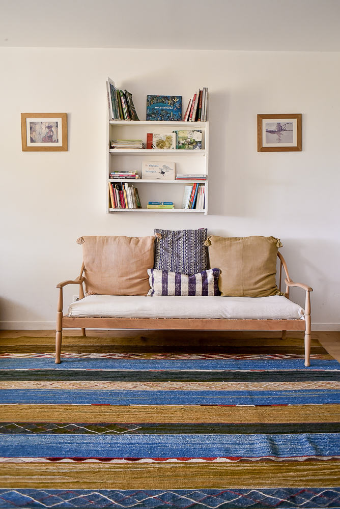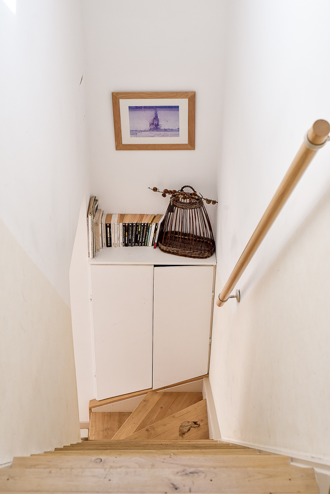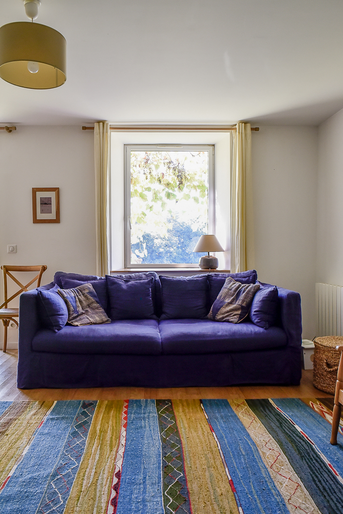 La lumière envahit les espaces intérieurs largement ouverts sur le vallon. Elle caresse les matériaux nobles (bois de châtaigner), le mobilier chiné avec soin, les pièces d’artisanat local et les tapis orientaux qui composent la décoration épurée, apaisante et délicate de la maison.